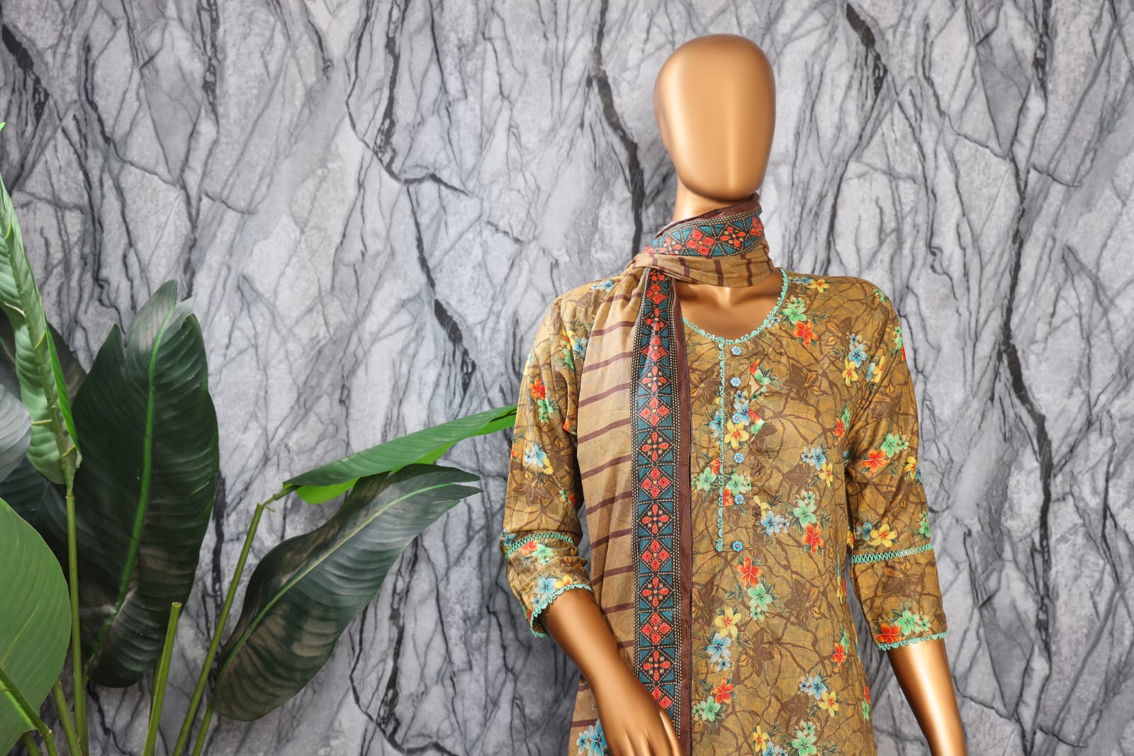 DESCRIPTION: THREE PIECE UNSTITCHED PRINTED COTTON DRESS.